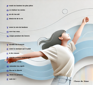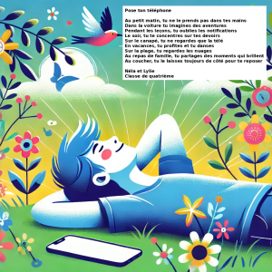 📌 Nela et Lylie (4ème) ont privilégié une approche poétique et imagée, incitant à « poser son téléphone » pour mieux profiter des moments de la vie quotidienne : observer la nature, rêver, danser, partager avec ses proches.
