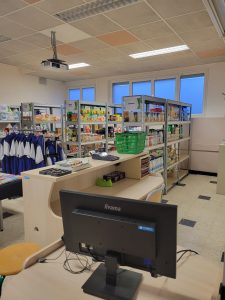 Nous avons équipé le magasin pédagogique d’une banque d’accueil, d’un PC caisse enregistreur et de tables, pour les CAP SAPVER.